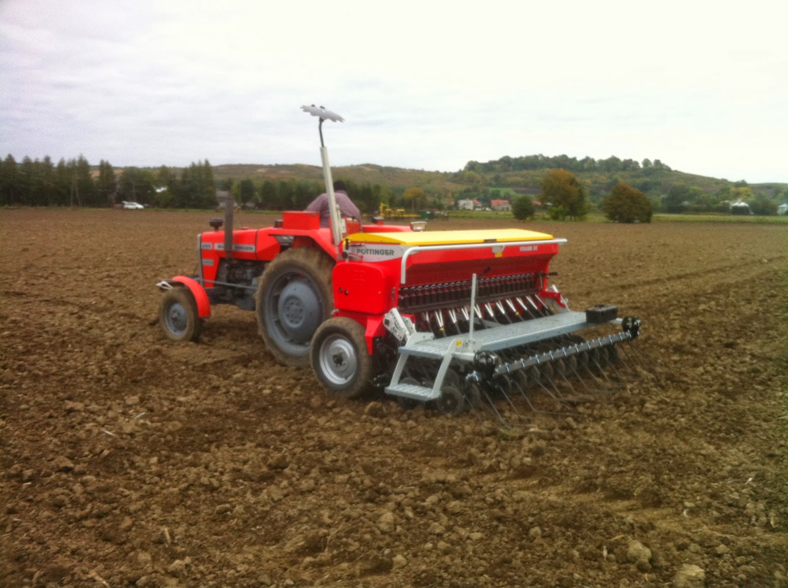 CiÄ…gnik Massey Ferguson 255 z siewnikiem Pottinger podczas siewu pszenicy